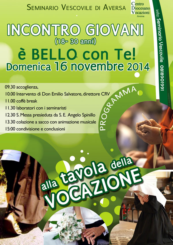 Domenica 16 novembre 2014 si svolgerà “è bello con Te!”, incontro con i giovani da 16 a 30 anni organizzato dal Centro Diocesano Vocazioni della diocesi di Aversa.