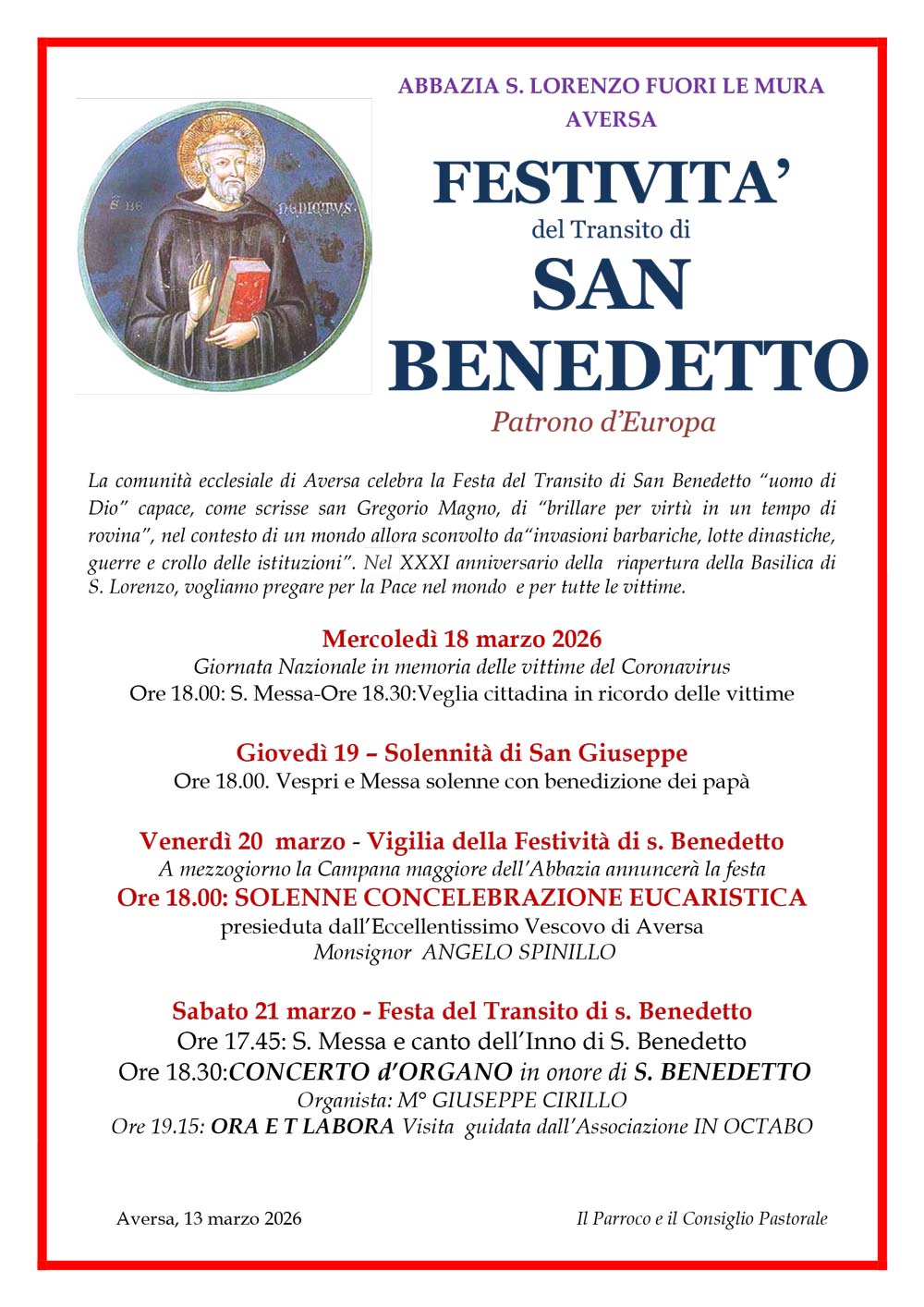 Venerdì 20 marzo 2026 | Vigilia della Festività di S. Benedetto