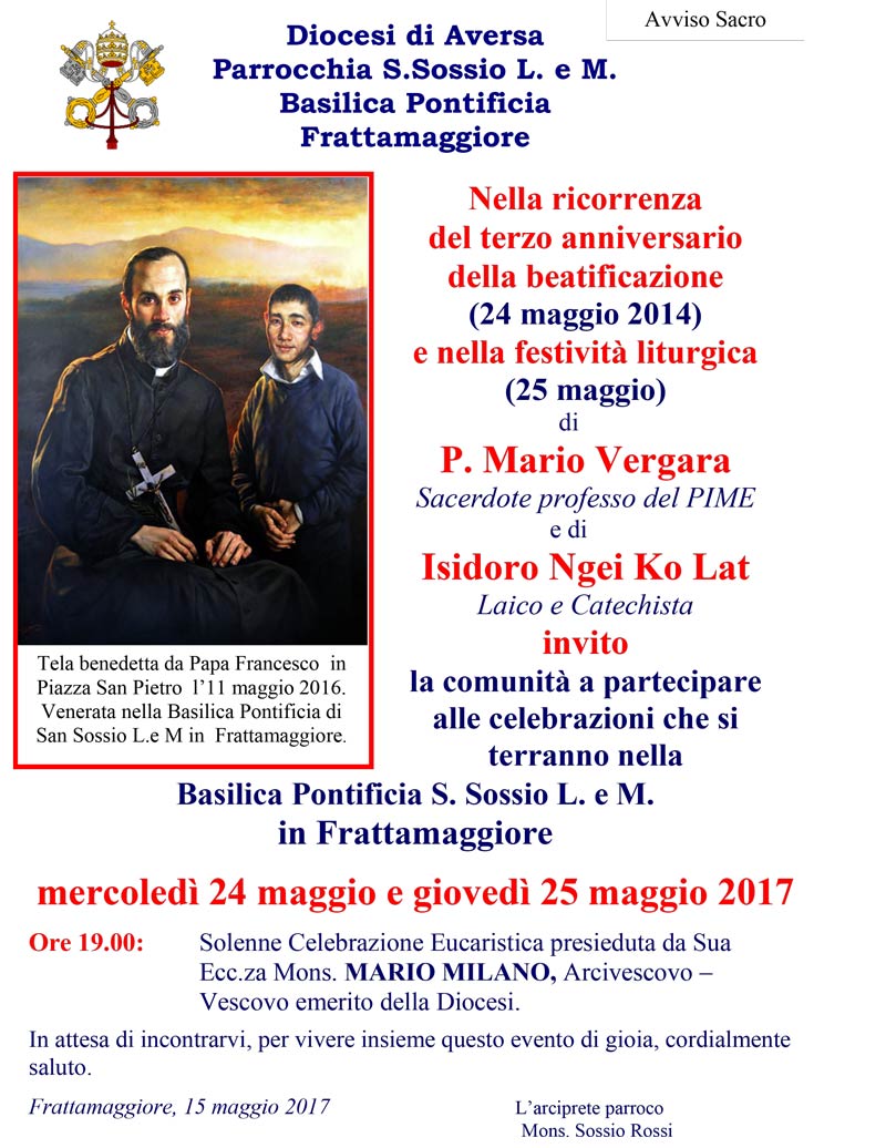 Nella ricorrenza del terzo anniversario della beatificazione (24 maggio 2014) e nella festività liturgica (25 maggio) di P. Mario Vergara, Sacerdote professo del PIME, e di Isidoro Ngei Ko Lat, Laico e Catechista, la comunità è invitata a partecipare alle celebrazioni che si terranno nella Basilica Pontificia S. Sossio L. e M. in Frattamaggiore