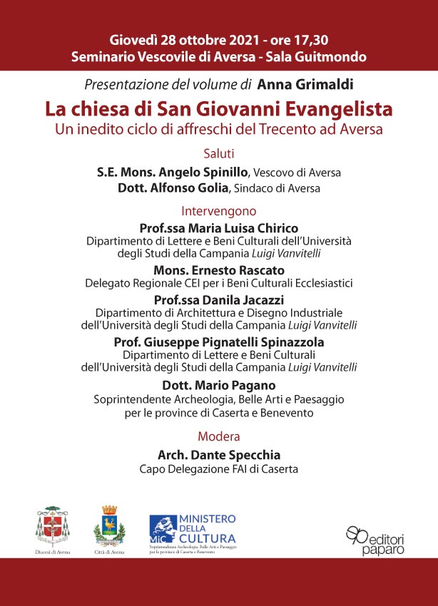 Giovedì 28 ottobre 2021 alle ore 17.30, presso la Sala Guitmondo del Seminario Vescovile di Aversa, verrà presentato il libro La chiesa di San Giovanni Evangelista. Un inedito ciclo di affreschi del Trecento ad Aversa.