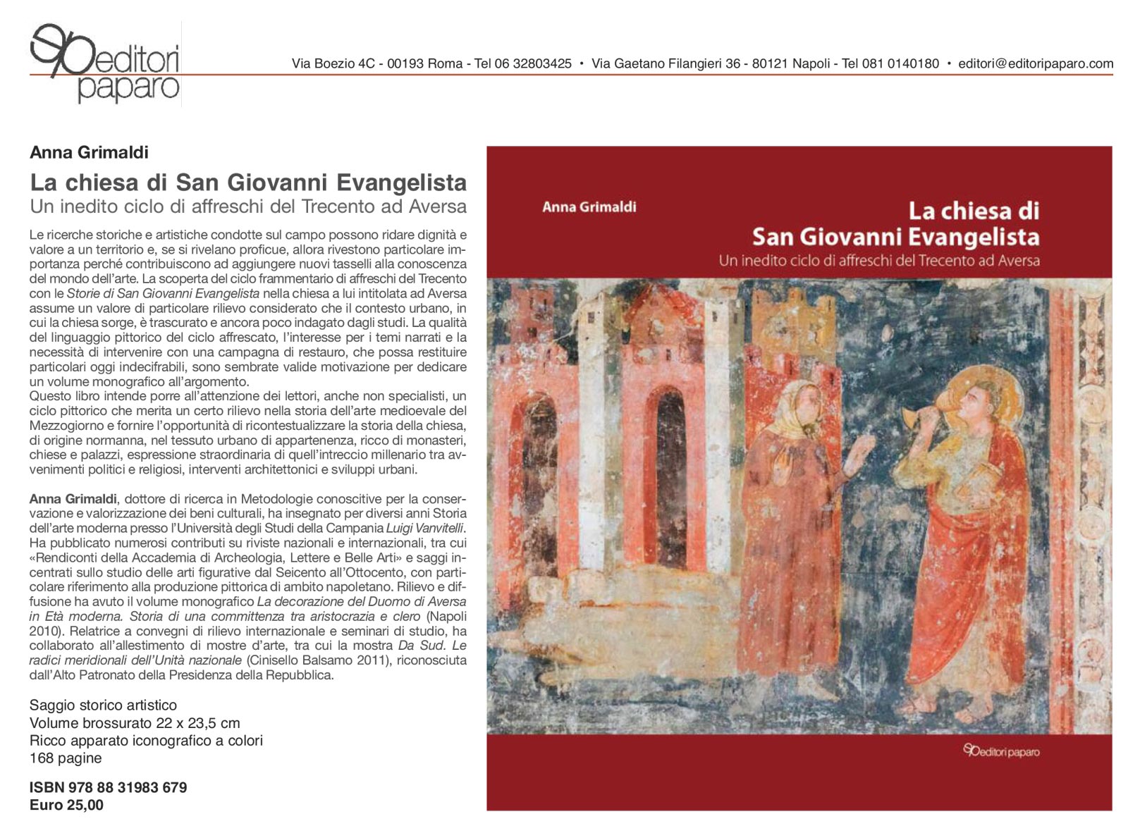 Con questo libro, l’Autrice, già professore a contratto di Storia dell’arte presso l’Università degli Studi della Campania Luigi Vanvitelli, storica dell’arte ed esperta della produzione pittorica di ambito napoletano, rende nota la scoperta di un interessante ciclo frammentario di affreschi del Trecento rinvenuto solo di recente ad Aversa. Il lavoro, condotto con rigore scientifico, si è avvalso di fonti documentarie primarie, come le Visite pastorali dell’Archivio Storico Diocesano, grazie anche alla preziosa collaborazione di Mons. Ernesto Rascato, Delegato Regionale per i Beni Culturali Ecclesiastici. Anna Grimaldi offre agli studiosi e ai cultori della civiltà del Mezzogiorno un importante aggiornamento della pittura trecentesca in ambito napoletano, andando così ad aggiungere nuove proposte di ricerca a quel complesso e ancora poco noto mosaico dell’arte in Campania.