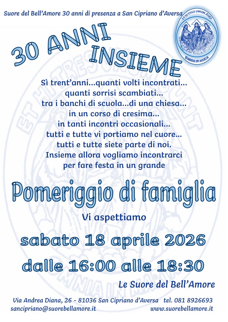 Per condividere la gioia di questo anniversario, la comunità è invitata a un “Pomeriggio di famiglia” sabato 18 aprile 2026, dalle ore 16:00 alle 18:30, presso la sede delle Suore del Bell’Amore (Via Andrea Diana, 26 – San Cipriano d’Aversa).