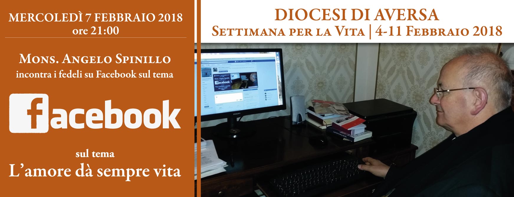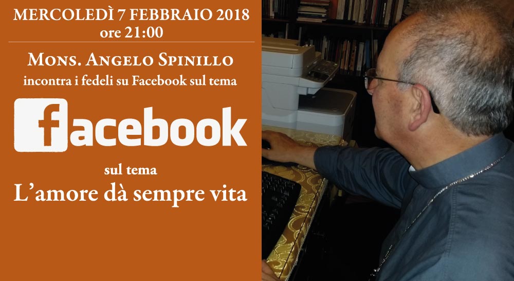 Lunedì 5 febbraio alle 21:00 il Vescovo di Aversa, Mons. Angelo Spinillo, si confronterà online con i fedeli sulla Pagina Facebook “Chiesa di Aversa”. L’occasione di questo nuovo forum virtuale è data dalla “Settimana per la Vita” che vivremo in diocesi dal 4 all’11 febbraio. Con Mons. Spinillo si discuterà sul tema “L’amore dà sempre vita”.