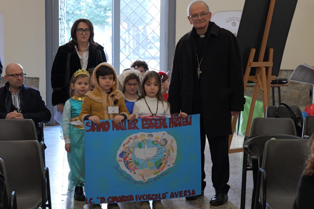 All’invito della Dirigente scolastica dell’I.C. Cimarosa, Margherita Diana, hanno risposto, oltre al vescovo mons. Angelo Spinillo, l’Unicef regionale con la presidente Emilia Narciso e il responsabile territoriale Mario Autore, la Comunità di Sant’Egidio con la prof.ssa Antonella Schiavitelli, il prof. Giuseppe Limone, il dott. Gaetano Romaniello come voce del mondo scout, la sig.ra Clelia Ponticiello come credente islamica.
