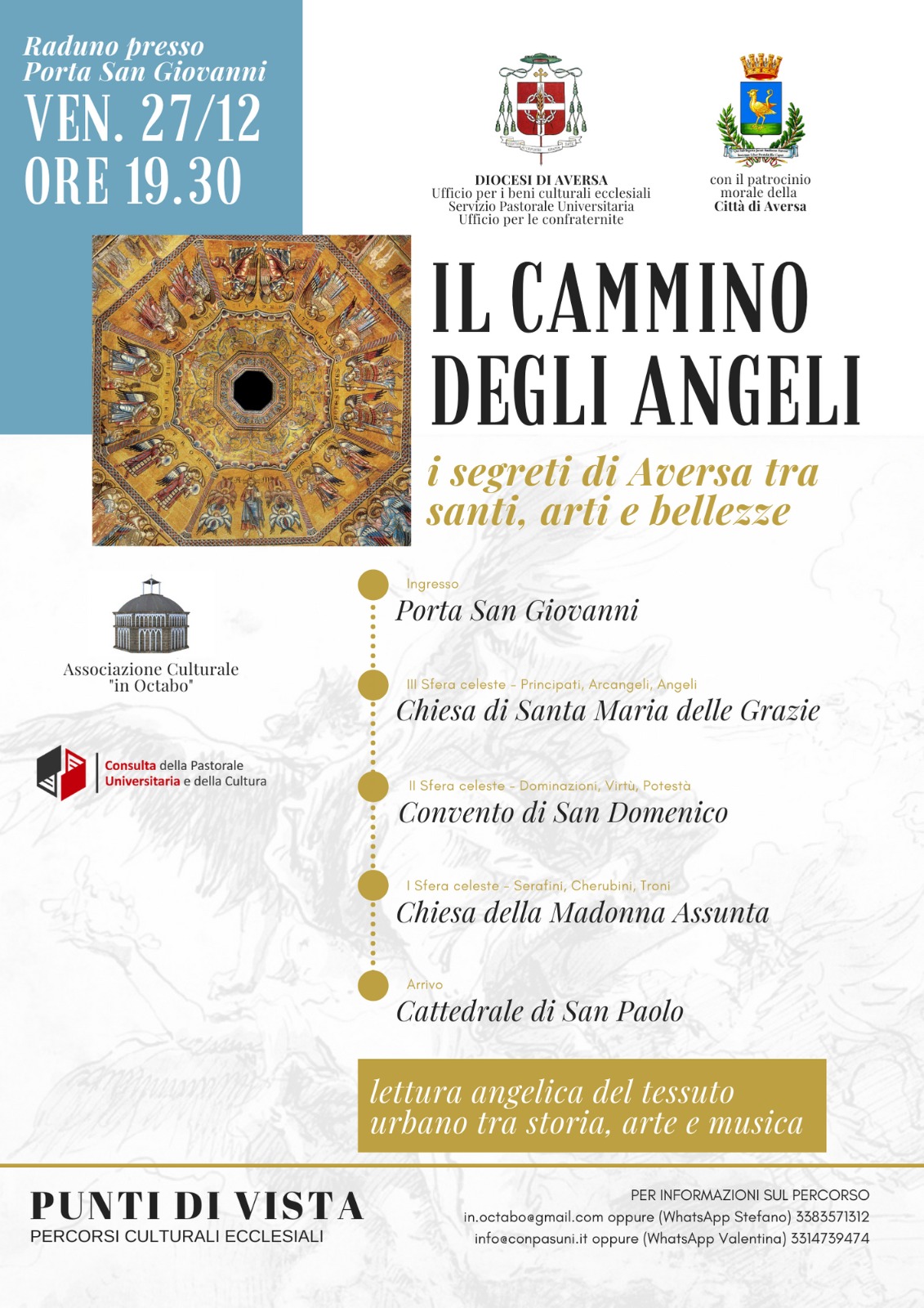 Saranno presenti alla visita insieme con il vescovo Angelo, che come sempre segue i lavori di CONPASUNI ed In Octabo, Mons. Ernesto Rascato, delegato regionale per i Beni culturali ecclesiali, don Mario Vaccaro, delegato diocesano della Pastorale Universitaria, don Michele Salato, delegato diocesano dell’Ufficio per le confraternite. “Camminando con gli Angeli” concluderà un ciclo di visite guidate che per tutto il mese di Dicembre sono state rivolte agli studenti delle scuole superiori e che hanno visto i giovani passeggiare per Aversa in questo mese con “AttrAversando con gli Angeli” per scoprire ed apprezzare il patrimonio storico-artistico della propria terra prima di partire alla scoperta delle capitali europee.