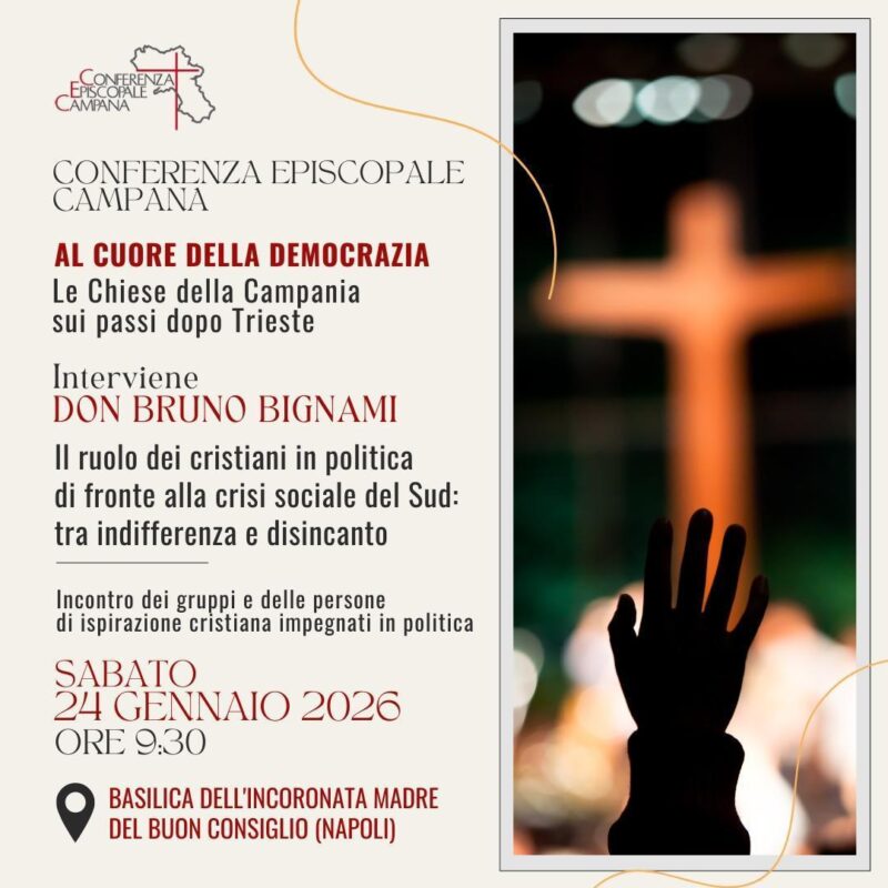 Carissime e carissimi, la Conferenza Episcopale Campana è lieta di invitarvi all’incontro “Al cuore della democrazia. Le Chiese della Campania sui passi dopo Trieste“, rivolto ai gruppi e alle persone di ispirazione cristiana impegnati in politica e nel servizio al bene comune. Viviamo un tempo segnato da profonde trasformazioni sociali, da ferite aperte nel tessuto democratico e da un diffuso sentimento di indifferenza e disincanto, … Continua a leggere Conferenza Episcopale Campana: Al cuore della democrazia