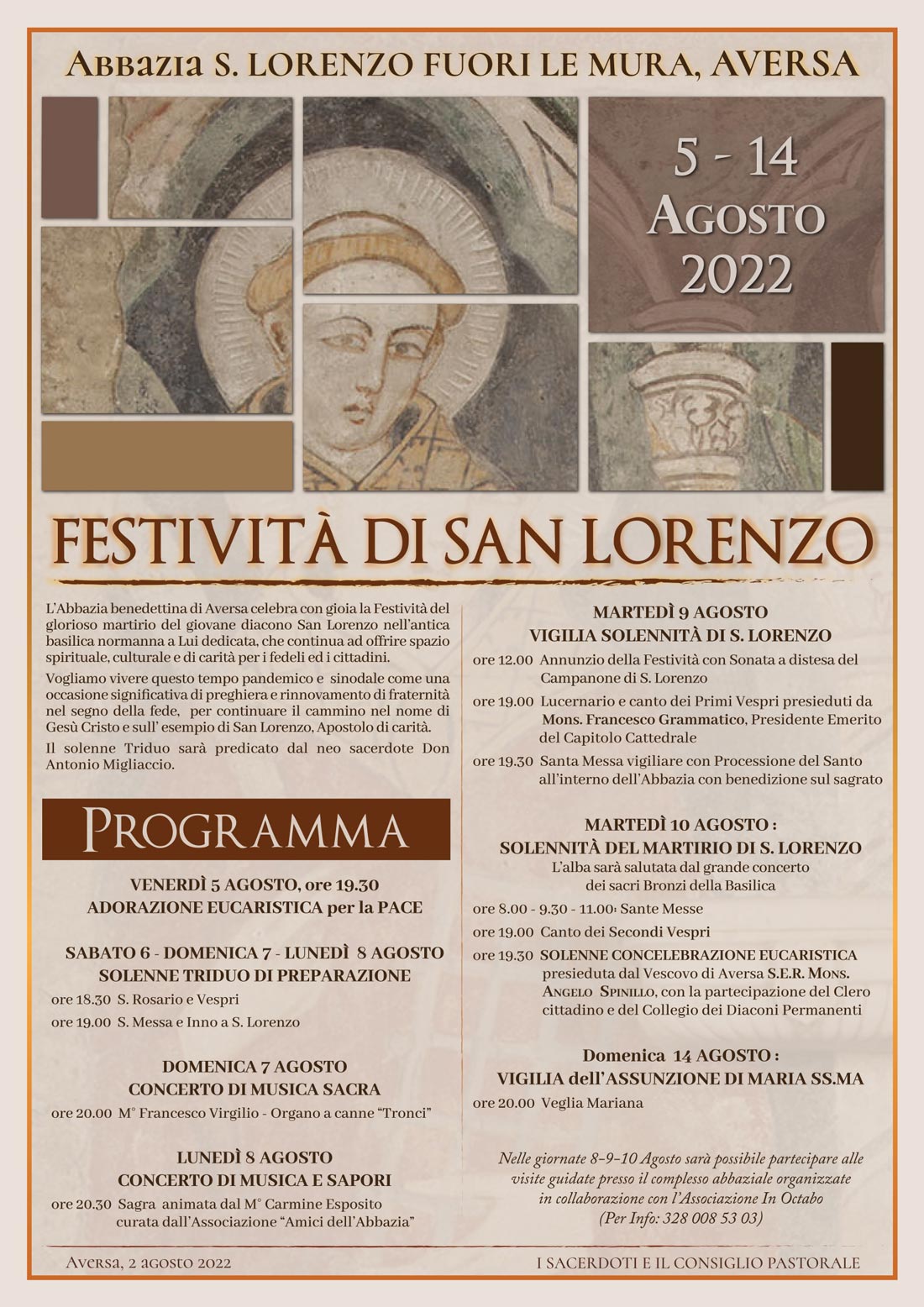 eventi, news, news parrocchie 29 Luglio 2022 admindiocesi Aversa, Festività di San Lorenzo 2022: il Programma CondividiFacebookTwitteremailLinkedin San-Lorenzo-2022-locandina-