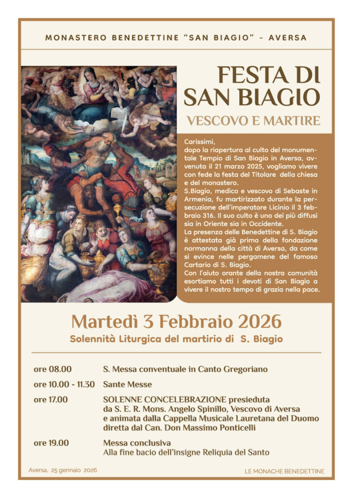 “Con l’aiuto orante della nostra Comunità – dichiara Madre Maria Consolata Ammutinato, Badessa del Monastero – invitiamo tutti i fedeli devoti di San Biagio a vivere questo tempo di grazia nella pace e nella fraternità”.