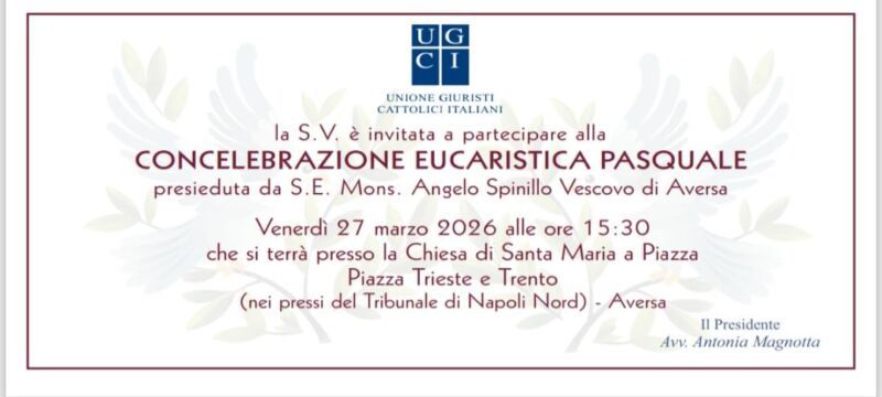 In preparazione alle prossime festività pasquali, l’Unione Giuristi Cattolici Italiani (UGCI) invita l’intera comunità e, in particolar modo, i professionisti del mondo della giustizia a un momento di spiritualità e comunione. Venerdì 27 marzo 2026, alle ore 15:30, si terrà una Concelebrazione Eucaristica Pasquale presieduta da S.E. Mons. Angelo Spinillo, Vescovo di Aversa. La celebrazione si svolgerà presso la Chiesa di Santa Maria a Piazza, … Continua a leggere Verso la Pasqua: l’Unione Giuristi Cattolici si ritrova in preghiera con il Vescovo Spinillo