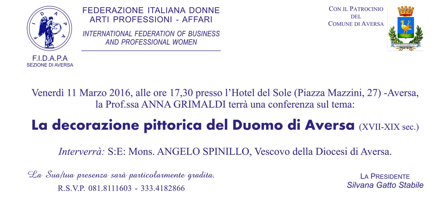 “La decorazione pittorica del Duomo di Aversa (XVII-XIX sec.)” è il titolo della conferenza che la prof.ssa ANNA GRIMALDI, docente a contratto di Storia dell’Arte Moderna presso la Seconda Università degli Studi di Napoli, terrà il giorno venerdì 11 marzo, alle ore 17:30, all’Hotel del Sole di Aversa. L’iniziativa è partita dalle socie della FIDAPA di Aversa, presieduta dalla prof.ssa Silvana Gatto. La FIDAPA è particolarmente onorata della presenza di S.E. Monsignor Angelo Spinillo, vescovo della Diocesi di Aversa, che rivolgerà al pubblico un saluto iniziale.