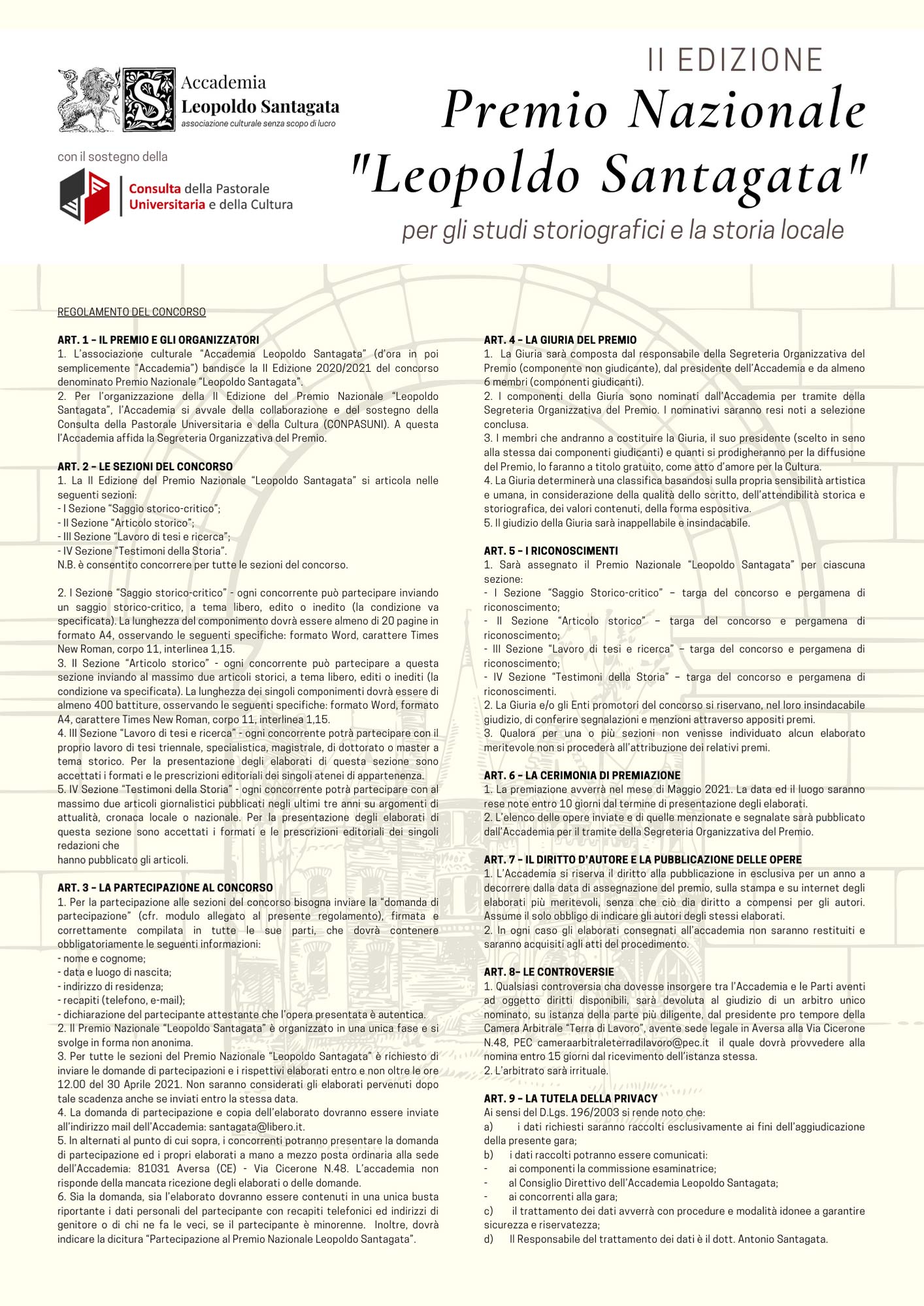 La II Edizione del Premio Nazionale “Leopoldo Santagata” nasce dalla collaborazione dell’Accademia Leopoldo Santagata, erede culturale degli studi del Professore brianese, e la Consulta della Pastorale Universitaria. Partecipare è semplice e gratuito: il concorrente poterà inviare i propri elaborati all’indirizzo mail santagata@libero.it oppure alla sede dell’Accademia Leopoldo Santagata in Via Cicerone, 48 – 81031 Aversa (CE). Si invita a prendere visione del Bando.