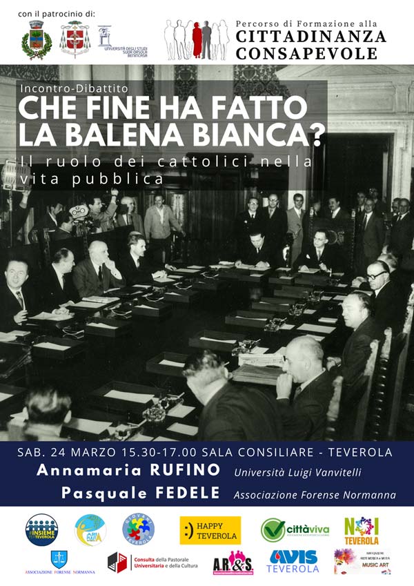 “CHE FINE HA FATTO LA BALENA BIANCA?” è il provocatorio titolo del secondo appuntamento del Percorso di Formazione alla Cittadinanza Consapevole promosso dalla Consulta della Pastorale Universitaria e della Cultura (CONPASUNI) con il patrocinio dell’Università degli Studi di Napoli “Suor Orsola Benincasa”, della Diocesi di Aversa e del Comune di Teverola.