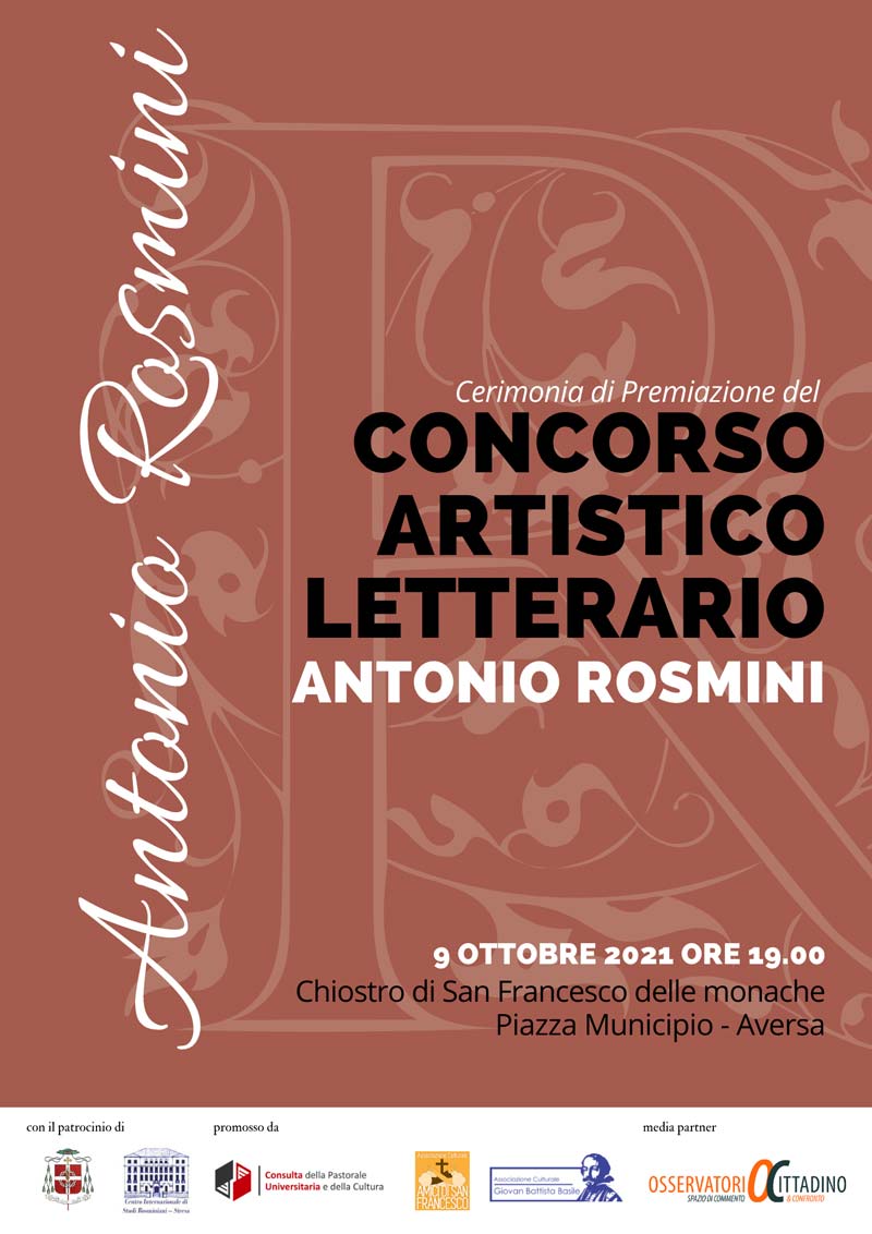 Al rientro dalle vacanze estive, ormai conclusa la fase di valutazione degli elaborati ammessi, la Giuria della III Edizione del Concorso Artistico-Letterario “Antonio Rosmini” ha annunciato la data della proclamazione e premiazione. La cerimonia avrà luogo sabato 9 ottobre ore 19.00 presso il Chiostro di San Francesco delle Monache ad Aversa.