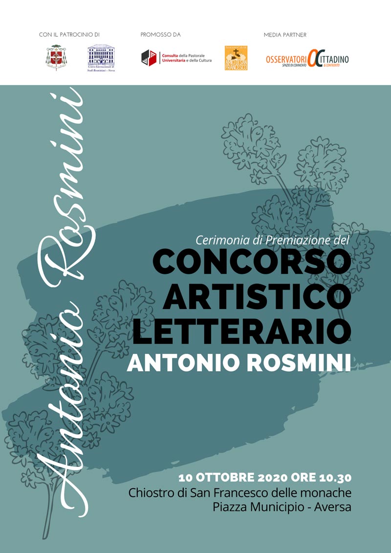 Si terrà sabato 10 Ottobre alle ore 10.30 la cerimonia di premiazione del Concorso Artistico-Letterario “Antonio Rosmini” promosso da CONPASUNI e dall’associazione “Amici di San Francesco” presso il chiostro del complesso monumentale di San Francesco ad Aversa.
