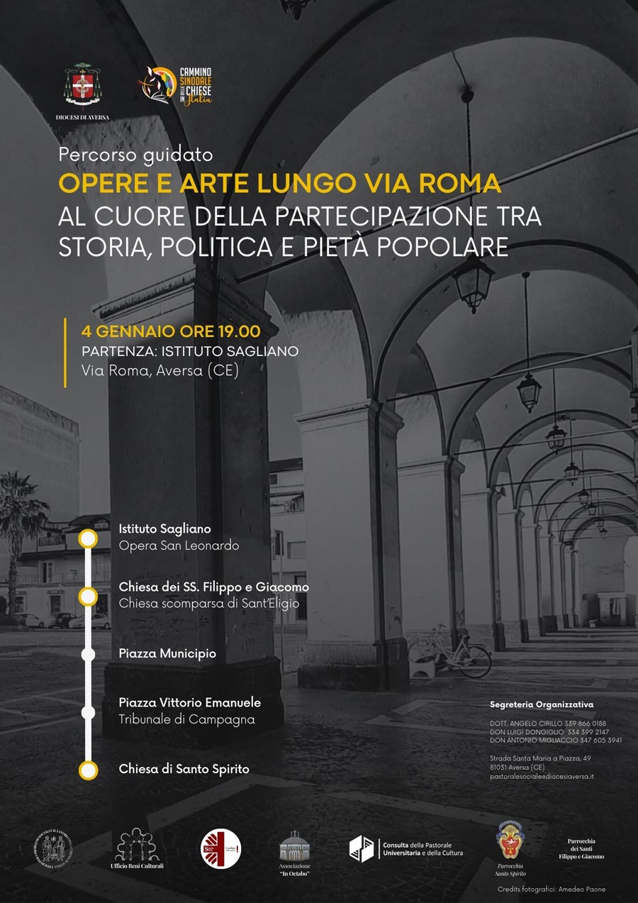 Giovedì 4 gennaio 2024, a partire dalle 19.00, chiese e palazzi di Via Roma ad Aversa saranno protagonisti della scena nel percorso guidato dal titolo “Opere e Arte lungo Via Roma”. La manifestazione, offerta e promossa dalla Diocesi di Aversa, prevede un aperitivo all’interno dell’Istituto Sagliano ed a seguire il percorso storico-artistico gratuito “Al cuore della partecipazione tra storia, politica e pietà popolare”.
