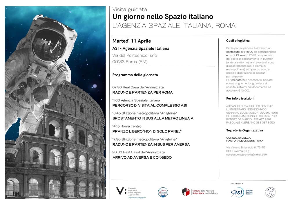Tutto pronto per la visita guidata all’Agenzia Spaziale Italiana (ASI) di Roma insieme con gli studenti dei corsi di studi in Ingegneria Aerospaziale dell’Università della Campania “Luigi Vanvitelli”. L’appuntamento fissato è per la prima mattinata di martedì 11 aprile presso la Real Casa dell’Annunziata – sede del Dipartimento di Ingegneria – per partire in pullman alla volta della Capitale e passare in rassegna le tante missioni che vedono protagonista l’Ingegneria Aerospaziale Italiana.