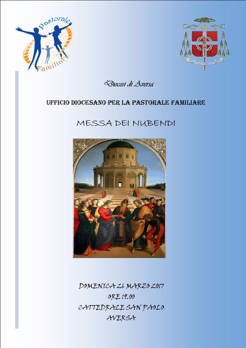 Domenica 26 marzo 2017, alle ore 19:00, nella Chiesa Cattedrale di Aversa, sarà celebrata la tradizionale Messa dei Nubendi. L’appuntamento vedrà impegnate tutte le coppie di futuri sposi che hanno partecipato ai corsi di preparazione al matrimonio nelle varie parrocchie della diocesi. I nubendi incontreranno il vescovo di Aversa, Mons. Angelo Spinillo, che benedirà le coppie e affiderà loro alcuni doni simbolici.