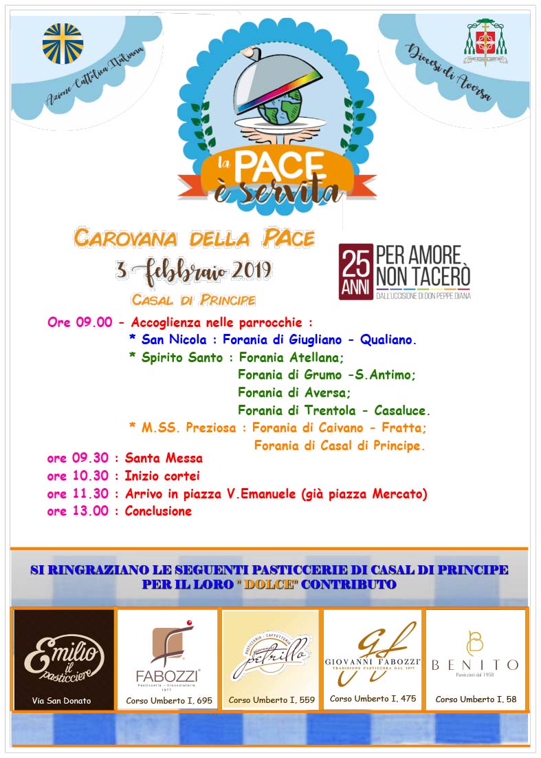 Domenica 3 febbraio 2019 dalle ore 9.00 alle ore 13.00 a Casal di Principe si terrà l’annuale Carovana della Pace Unitaria che anche quest’anno apre le celebrazioni della Settimana Diocesana per la Vita in comunione con il nostro Pastore e tutta la Chiesa locale.