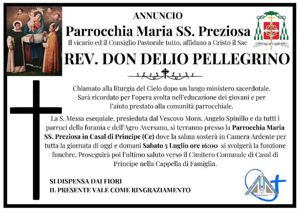 La S. Messa esequiale, presieduta dal Vescovo Mons. Angelo Spinillo e da tutti i parroci della forania e dell’Agro Aversano, sarà celebrata domani, sabato 5 luglio 2025 alle ore 16:00 presso la Parrocchia Maria SS. Preziosa in Casal di Principe.