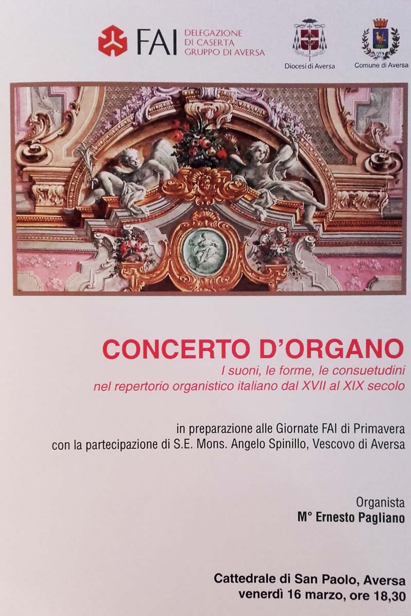 In occasione della preparazione alle Giornate FAI di Primavera, quest’organo verrà suonato dal maestro napoletano Ernesto Pagliano, tra i maggiori organisti attivi a Napoli; vanta una lunga e qualificata carriera artistica come Direttore d’Orchestra e Direttore di ensemble vocali e strumentali in prestigiosi sedi quali l’Auditorium RAI di Napoli. Attualmente è Organista e Maestro di Cappella della Basilica di San Domenico Maggiore e della Basilica dell’Immacolata al Gesù Vecchio a Napoli. Si esibirà nella Cattedrale di Aversa con un programma ricco di antichi brani musicali, tratti dal repertorio organistico italiano dal XVII al XIX secolo.