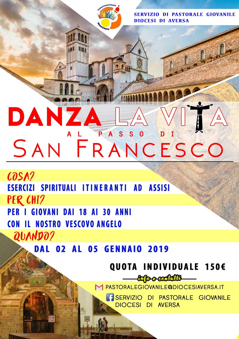 Abbiamo dunque scelto di proporre alcuni giorni di Esercizi spirituali per giovani in compagnia del nostro vescovo, e vogliamo farlo vivendo i luoghi di Francesco, ci recheremo, dunque ad Assisi e lo faremo in un periodo molto intenso e particolare dell’anno dal 2 al 5 Gennaio 2019.