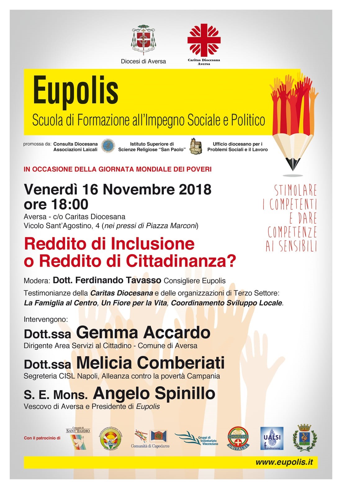 “Reddito di Inclusione o Reddito di Cittadinanza?”, è questo il tema del convegno che si terrà venerdì 16 novembre ad Aversa, a partire dalle ore 18.00, presso la Caritas Diocesana, in Vicolo Sant’Agostino 4. L’appuntamento, organizzato da ‘Eupolis – Scuola di Formazione all’Impegno Sociale e Politico’ della Diocesi di Aversa, rientra nel programma delle manifestazioni per la ‘Giornata Mondiale dei Poveri’ del 18 novembre, istituita da Papa Francesco nel 2016 al termine del Giubileo della Misericordia. Stimolare il confronto sui percorsi da attuare per rendere queste misure non un semplice intervento assistenziale, ma volano di un radicale cambiamento delle politiche contro la povertà; sollecitare la creazione di un collante tra le esperienze virtuose e le difficoltà del nostro territorio, dove spesso i politici si fanno erogatori di un favore, piuttosto che garanti di un diritto; presentare esperienze positive e propositive del nostro territorio. Sono questi gli obiettivi del convegno, il quale è stato preceduto da un costante lavoro di ricerca che ha coinvolto Caf, Centri per l’Impiego, cooperative, ordini professionali, assistenti sociali, Amministrazioni comunali, uffici diocesani e associazioni. I risultati della ricerca verranno portati a conoscenza della platea attraverso la distribuzione di materiale contenente i dati raccolti e le esperienze territoriali. Modererà l’incontro Ferdinando Tavasso, consigliere di Eupolis. Previste le concrete testimonianze della Caritas Diocesana, con Emilio Di Fusco, e delle organizzazioni del Terzo Settore: ‘La Famiglia al Centro’, con Arturo Palma, ‘Un Fiore per la Vita’, Giuliano Ciano, ‘Coordinamento Sviluppo Locale’, Pasqualino Costanzo. Interventi di Gemma Accardo, Dirigente Area Servizi al Cittadino del Comune di Aversa, e Melicia Combierati, della Segreteria Cisl di Napoli e referente per la Campania della ‘Alleanza contro la povertà’. Conclusioni di S.E. Mons. Angelo Spinillo, Vescovo di Aversa e Presidente di Eupolis.
