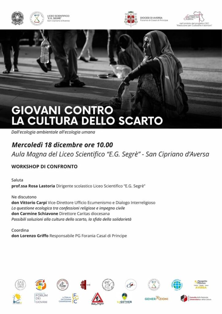“Giovani contro la cultura dello scarto” è il tema e il titolo del secondo workshop – parte di un ciclo di tre momenti formativi dedicato agli studenti del Liceo Segrè – durante il quale interverranno don Vittorio Carpi, vice-direttore dell’Ufficio Ecumenismo e Dialogo Interreligioso, e don Carmine Schiavone, direttore della Caritas diocesana; coordinatore dell’incontro il responsabile foraneo di Pastorale Giovanile don Lorenzo Griffo. Continua così il progetto di Custodia del Creato promosso dalla Forania di Casal di Principe e risultato vincitore del bando 2024 della Conferenza Episcopale Campana (CEC) dal titolo “Rieducare per custodire il domani”.