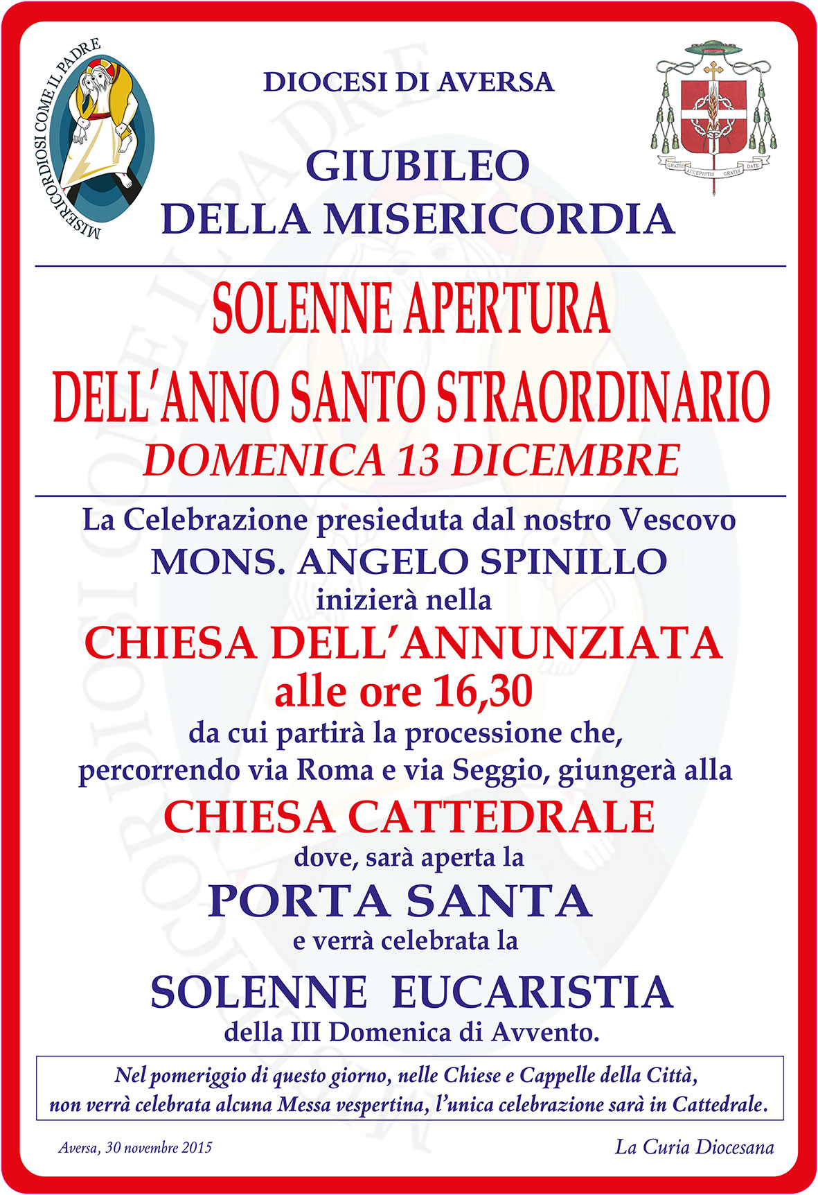 Nel pomeriggio di questo giorno, nelle Chiese e Cappelle della Città di Aversa, non verrà celebrata alcuna Messa vespertina, l’unica celebrazione sarà in Cattedrale.