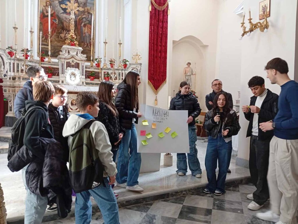 Prosegue così il percorso di “Il Lavoro e le Confraternite”, il progetto di riscoperta dell’identità economica e politica delle confraternite, promosso dall’Ufficio diocesano per le Confraternite, in collaborazione con la Pastorale Sociale e del Lavoro e l’associazione AversaTurismo. Dopo il primo incontro dal titolo “Nuove prospettive di impresa”, giovedì 19 febbraio – guidati da Angelo Cirillo e Gabriel Solnita del Progetto Policoro e da Gabriele Fabrizio del collettivo Fahrenheit – gli studenti sono passati ad approfondire la conoscenza della confraternita, cimentandosi attivamente in un laboratorio di comunità secondo una metodologia di cooperative learning e di didattica verticale. Insieme con loro, hanno preso parte attiva al workshop anche i docenti accompagnatori: Anna Denito per l’I.T.E. “A. Gallo”, Manuela Sergio, Lucrezia Fermiamo e Salvatore Farina per l’I.C. “A. De Curtis”, Nicolina Di Martino, Potenza Madonna e Anna Fabozzo per l’I.C. “G. Ungaretti” di Teverola.