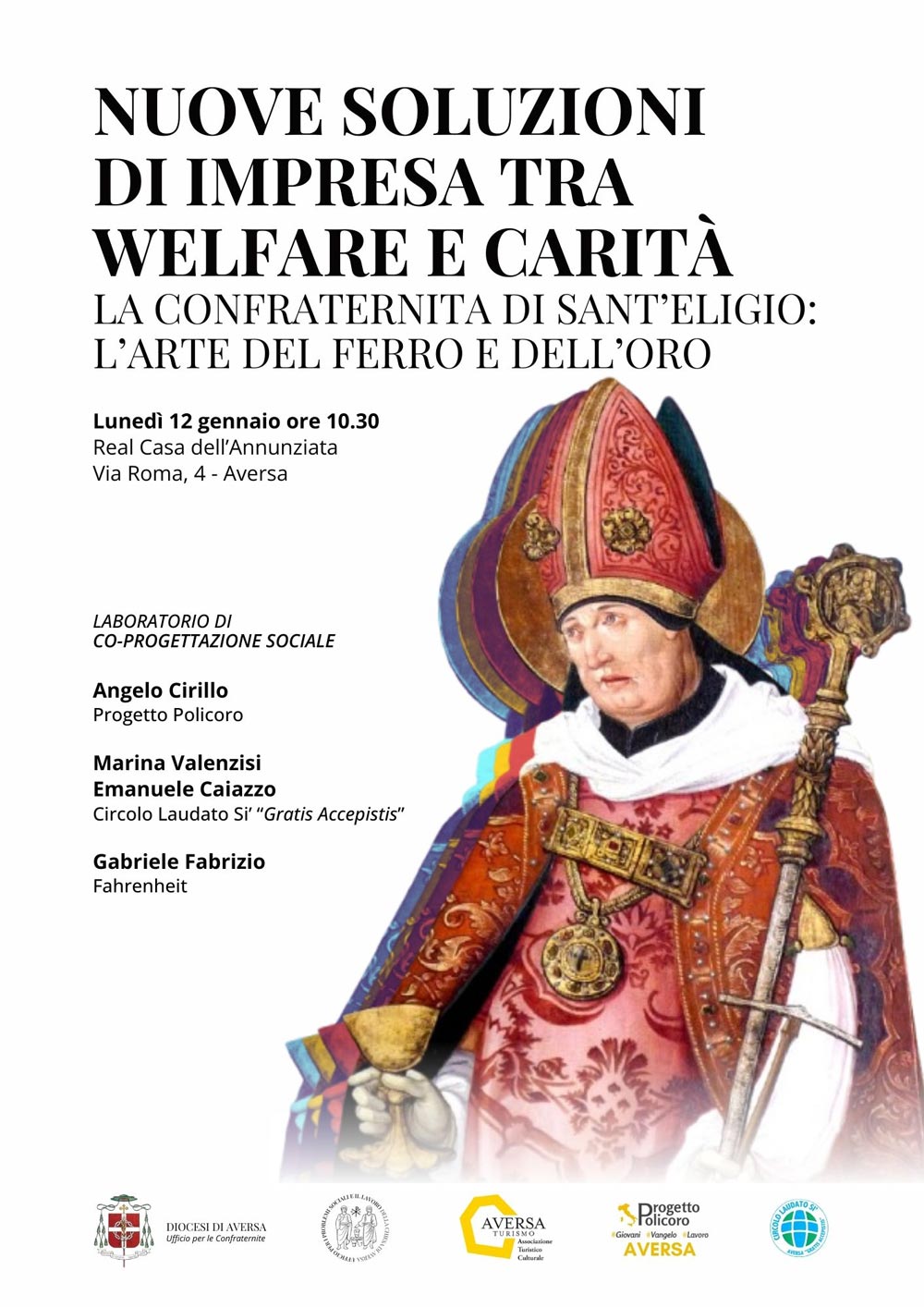 Oggetto dell’incontro sarà la conoscenza della Confraternita di Sant’Eligio, la congrega del mestiere dei fabbri e degli orafi che oggi ha sede presso l’Annunziata di Aversa. Insieme con l’AdC del Progetto Policoro Angelo Cirillo e con gli animatori del Circolo Laudato Si’ Aversa “Gratis Accepistis” – Emanuele Caiazzo, Marina Valenzisi e Gabriele Fabrizio – gli studenti degli istituti scolastici aversani, di ogni ordine e grado, conosceranno la storia e la mission del sodalizio co-progettandone il futuro, tra welfare e carità.