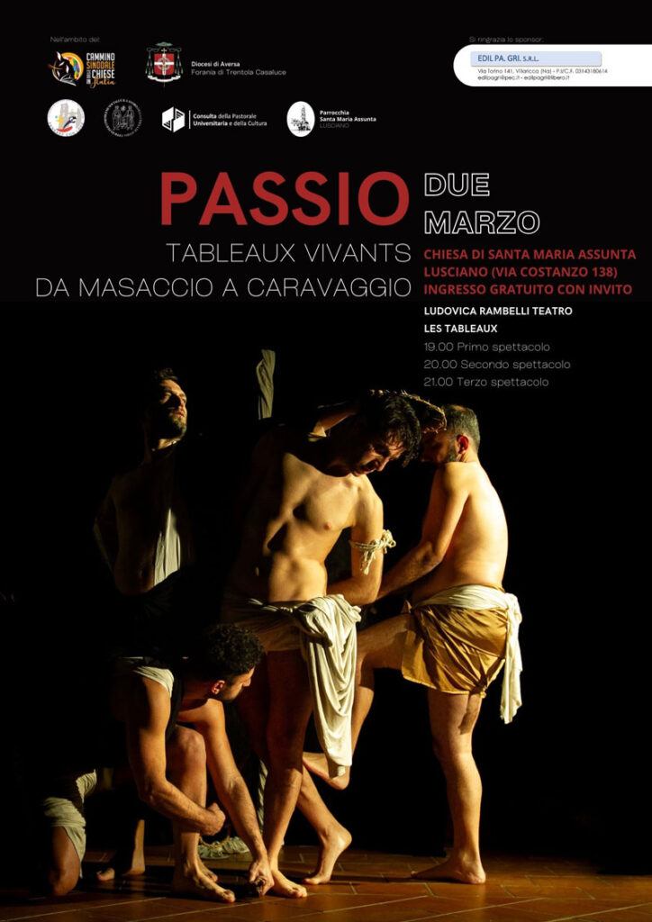 Lo spettacolo “Passio. Tableaux vivants da Masaccio a Caravaggio” di Ludovica Rambelli Teatro torna in Diocesi di Aversa sabato 2 marzo con tre spettacoli nella chiesa di Santa Maria Assunta a Lusciano. Le rappresentazioni – alle ore 19.00, alle 20.00 e alle 21.00 – sono promosse dall’Ufficio Pastorale Universitaria, dall’Ufficio per i Problemi sociali e il Lavoro e dalla Consulta della Pastorale Universitaria, nell’ambito degli incontri di cultura e spiritualità in tempo di Quaresima.
