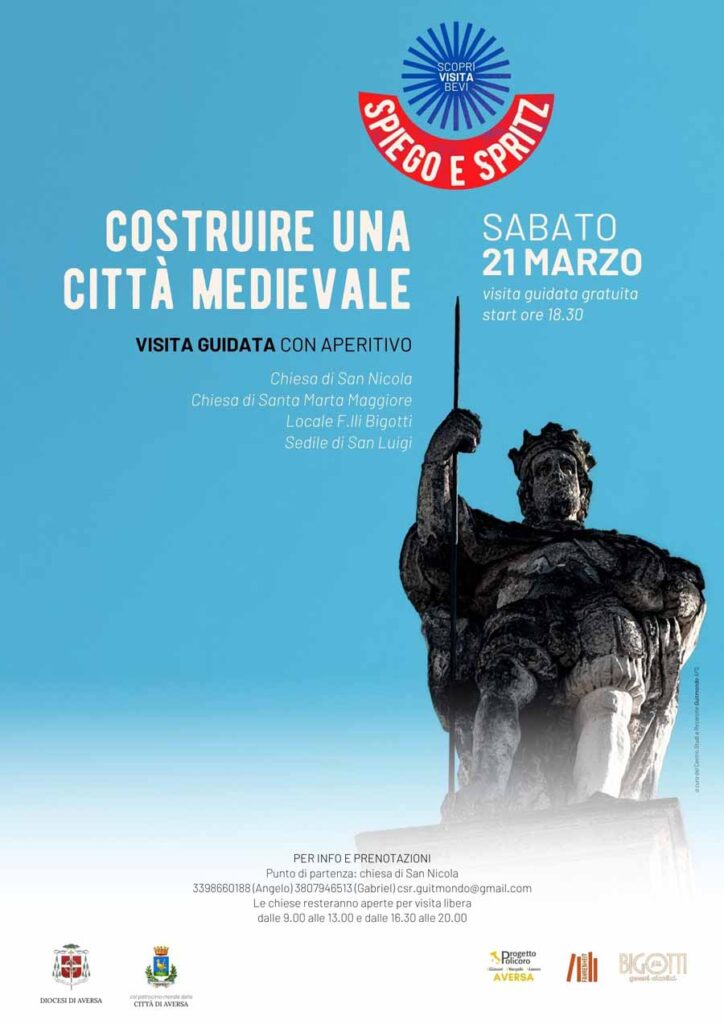 Il primo appuntamento di “Spiego e Spritz” sarà dedicato alla zona di San Domenico e al borgo di San Nicola. Per questa tappa – la prima di un ciclo di percorsi mensili – è stato scelto il titolo “Costruire una città medievale”. La visita guidata partirà dalla chiesa monumentale di San Nicola attraversando i vicoli della città normanna, durante il percorso i partecipanti potranno scoprire le vicende fondative di Aversa, i segreti e le bellezze della chiesa di Santa Marta Maggiore e della confraternita della Purificazione, la vita civile presso il Sedile di San Luigi – all’ombra del convento dei Domenicani che fu il primo municipio aversano – e raggiungere infine piazza San Domenico per un momento di socialità con aperitivo.