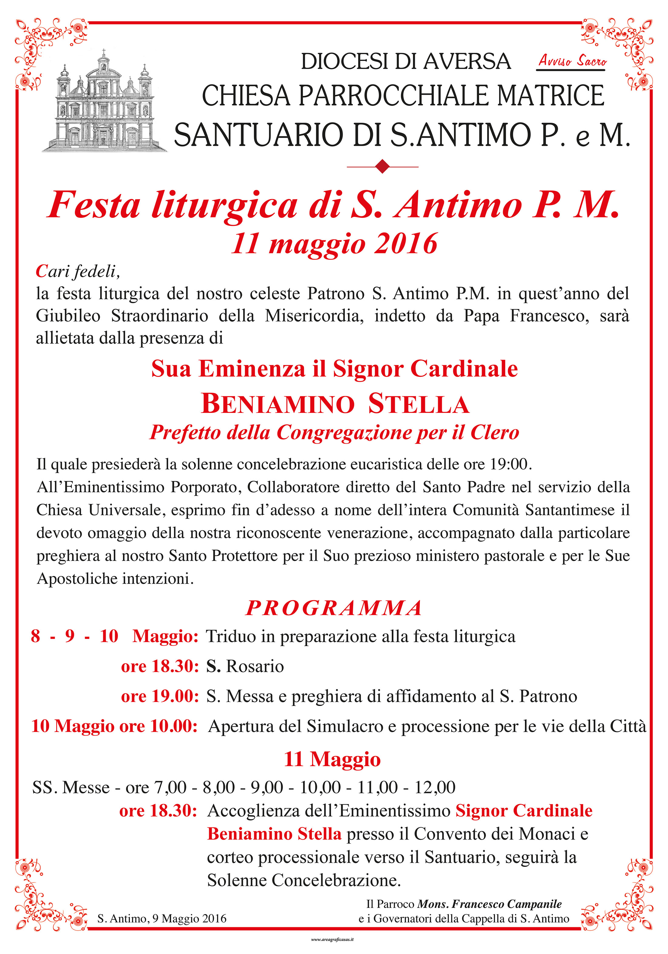 Chiesa_santantimo-smLa festa liturgica del Patrono S. Antimo P.M. sarà quest’anno allietata dalla presenza di Sua Eminenza il Signor Cardinale Beniamino Stella, Prefetto della Congregazione per il Clero, il quale mercoledì, 11 maggio 2016, presiederà la solenne concelebrazione eucaristica delle ore 19:00.