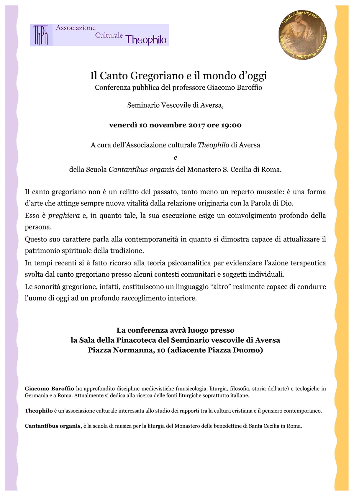 Venerdì 10 novembre 2017, alle ore 19:00, il Seminario Vescovile di Aversa ospiterà “Il Canto Gregoriano e il mondo d’oggi”, conferenza pubblica del professore Giacomo Baroffio. L’evento è stato organizzato dall’Associazione culturale Theophilo di Aversa.
