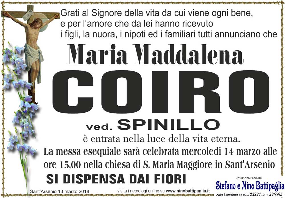 Apprendiamo la notizia della dipartita della signora Maria Maddalena Coiro, mamma del nostro vescovo Mons. Angelo Spinillo. Il cordoglio di tutta la comunità si fa preghiera di suffragio per l’anima benedetta della signora Maria Maddalena, che ritorna nella casa del Padre. Nella preghiera, ci stringiamo con affetto al nostro Vescovo e alla sua famiglia in questo momento di dolore, per scorgere già l’alba del nuovo giorno promesso ai suoi servi fedeli.