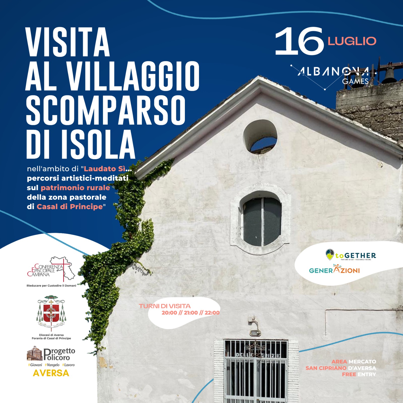 Il percorso “Visita al Villaggio scomparso di Isola” è parte del progetto intitolato “Laudato Sì… percorsi artistici-meditati sul patrimonio rurale”, promosso dalle Parrocchie della Forania di Casal di Principe, dalle Associazioni giovanili del territorio, e dagli Organismi pastorali diocesani, che a maggio è risultato vincitore del Bando della Conferenza Episcopale Campana (CEC) per la Custodia del Creato. Dopo un primo incontro di presentazione a Casal di Principe con “Aperiprecious. Giovani custodi della Casa comune” parte quindi un ciclo di appuntamenti sul territorio di Casapesenna, San Cipriano d’Aversa, Villa di Briano, Villa Literno e Casal di Principe dedicato alla Custodia della Casa comune, al rispetto dell’Ambiente, all’Ecologia integrale, all’Economia sostenibile, alla Bellezza.