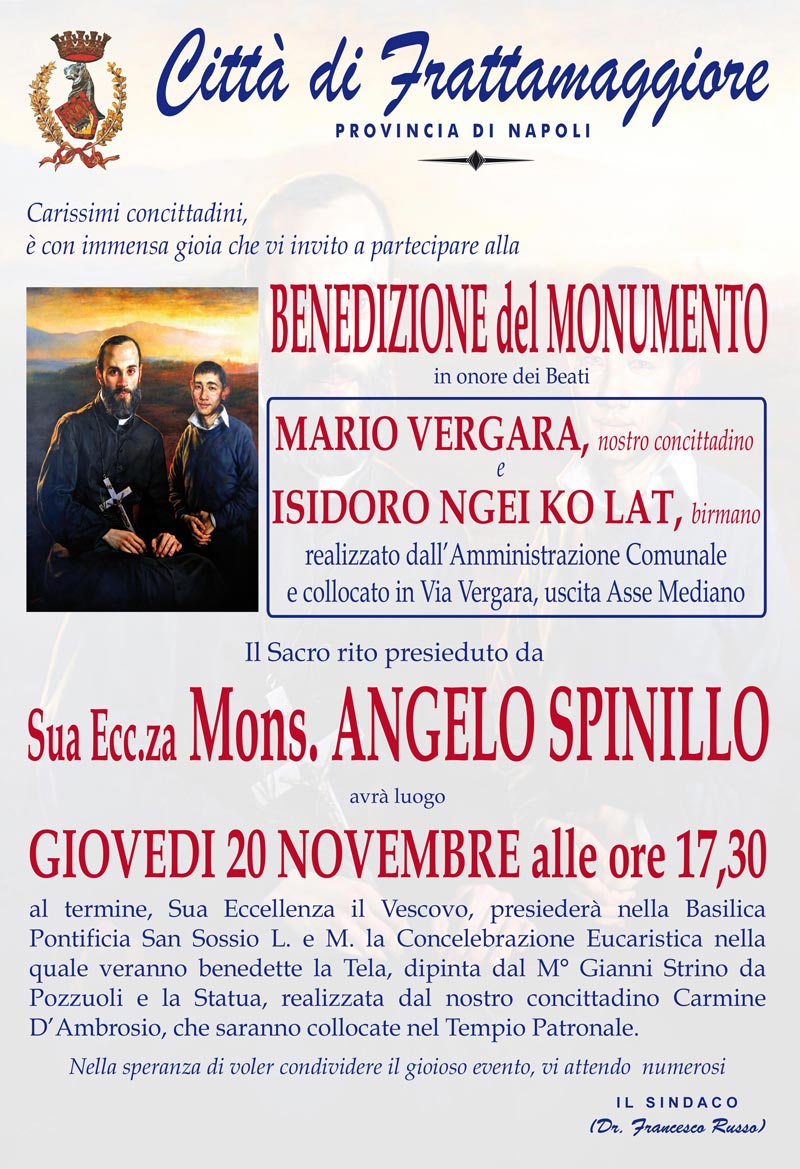 Giovedì 20 novembre, alle ore 17,30, avrà luogo la Benedizione del Monumento in onore dei Beati Mario Vergara, nostro concittadino e Isidoro Ngei Ko Lat, birmano, realizzato dall’Amministrazione Comunale e collocato in Via Vergara, uscita Asse Mediano,