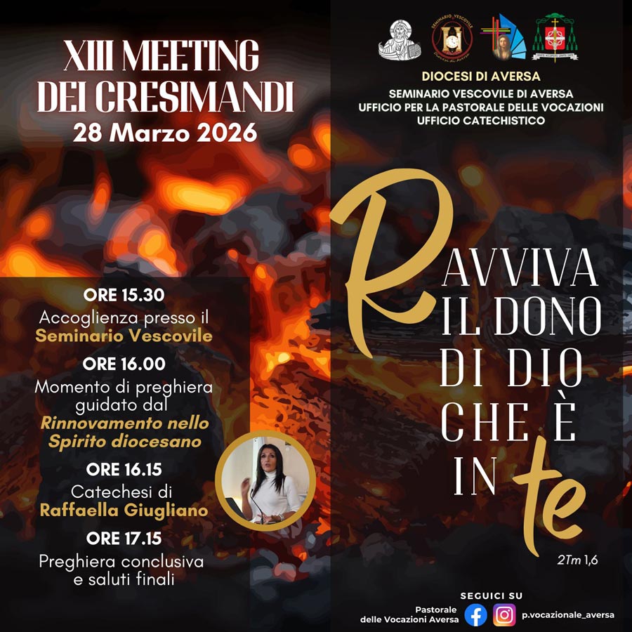 Sabato 28 marzo 2026, il Seminario Vescovile di Aversa aprirà le sue porte per il XIII Meeting dei Cresimandi, un evento promosso dall’Ufficio Catechistico insieme all’Ufficio per la Pastorale delle Vocazioni.