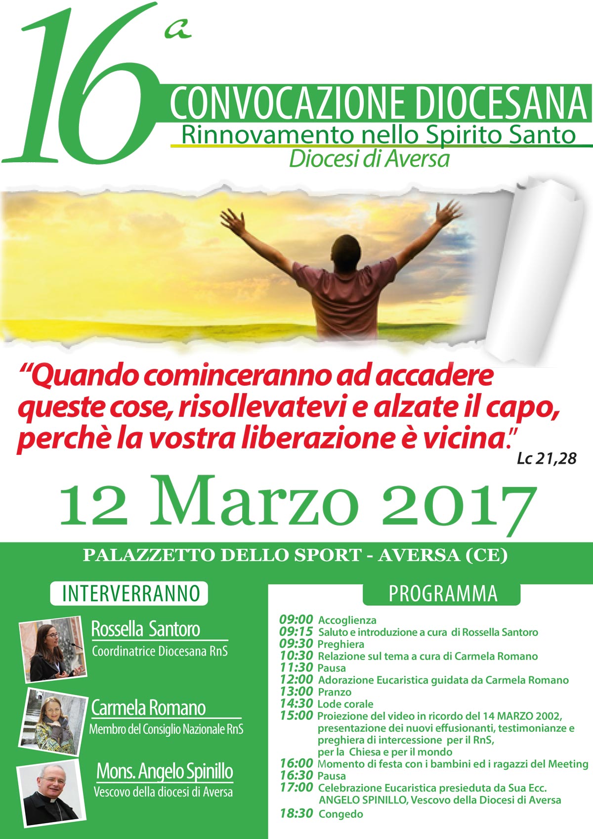 “Quando cominceranno ad accadere queste cose,risollevatevi e alzate il capo,perche la vostra liberazione è vicina” (Lc 21,28) Le parole del vangelo di Luca saranno il tema della XVI convocazione dei gruppi del Rinnovamento nello Spirito Santo della Diocesi di Aversa, che si terrà Domenica 12 Marzo presso il palazzetto dello sport di Aversa. Una giornata di grande grazie,un’occasione per incontrare Cristo e fare esperienza del suo amore.