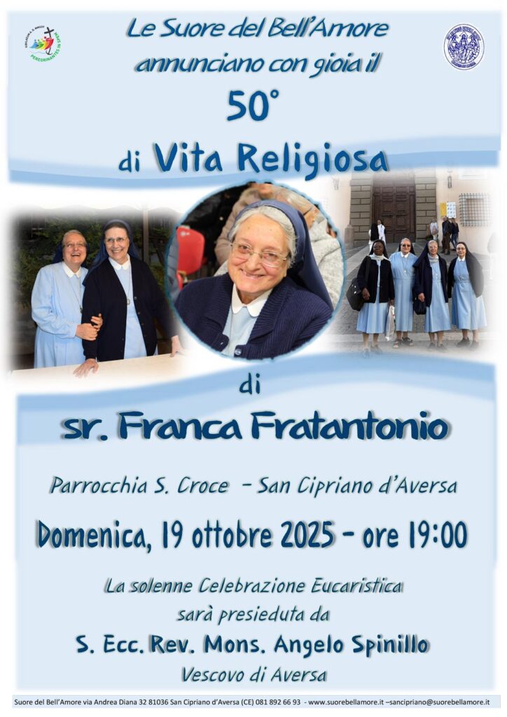 Le Suore del Bell’Amore annunciano con gioia il 50° di Vita Religiosa di sr. Franca Fratantonio.