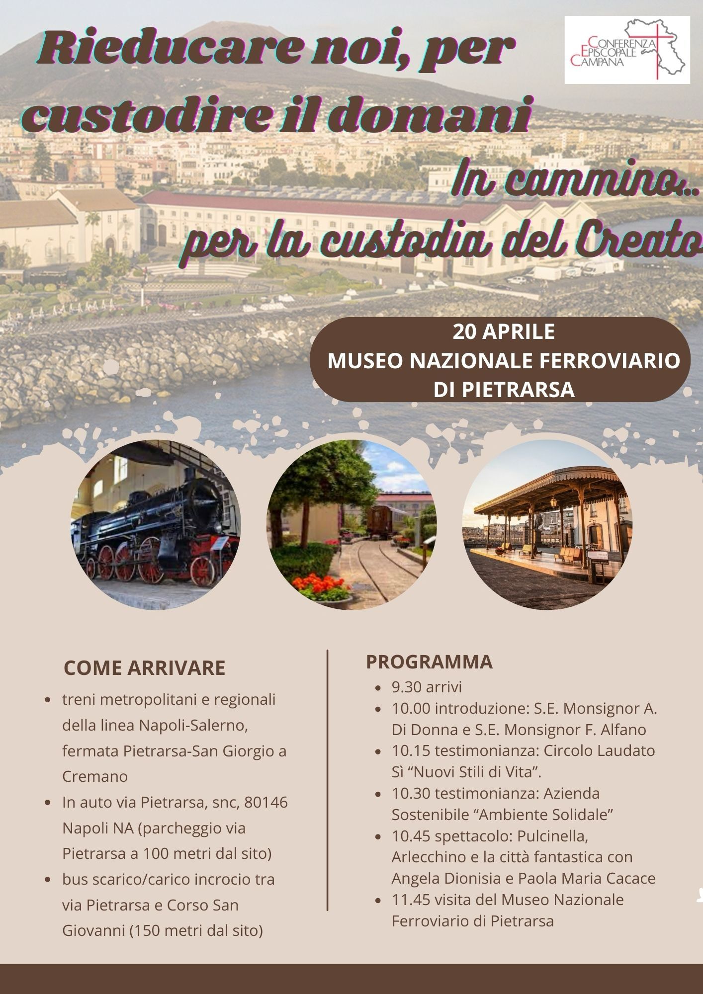 Appuntamento a sabato 20 aprile mattina, a partire dalle ore 9.30, al Museo Nazionale Ferroviario di Pietrarsa a Portici per la convention dal titolo “Rieducare noi, per custodire il domani”, il momento promosso dai Vescovi della Campania per concludere il percorso sulla Salvaguardia del Creato intrapreso a Pompei lo scorso 28 settembre.