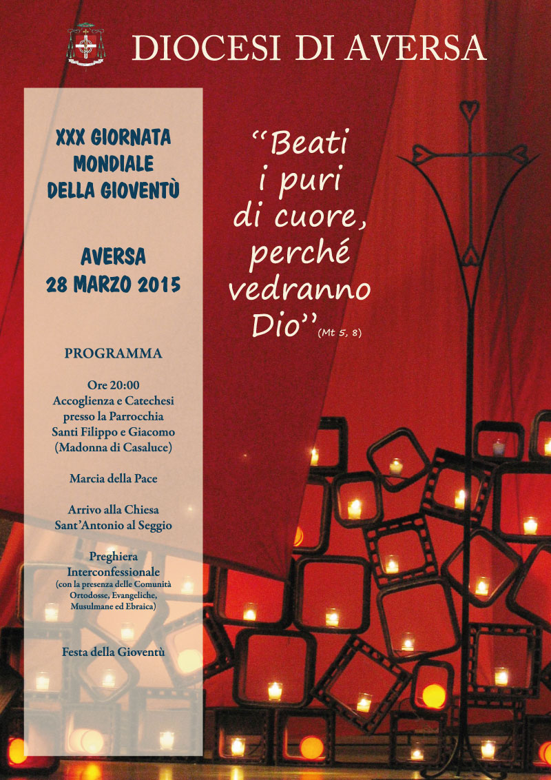 In occasione della XXX Giornata Mondiale dei Giovani che quest’anno si celebra nelle diocesi di tutto il mondo accompagnato dal messaggio “Beati i puri di cuore, perché vedranno Dio” (Mt 5, 8), il Servizio per la Pastorale Giovanile della diocesi di Aversa, a nome del vescovo Mons. Angelo Spinillo, invita i giovani e le comunità parrocchiali a partecipare ad un momento di preghiera e riflessione che si svolgerà ad Aversa sabato 28 marzo.