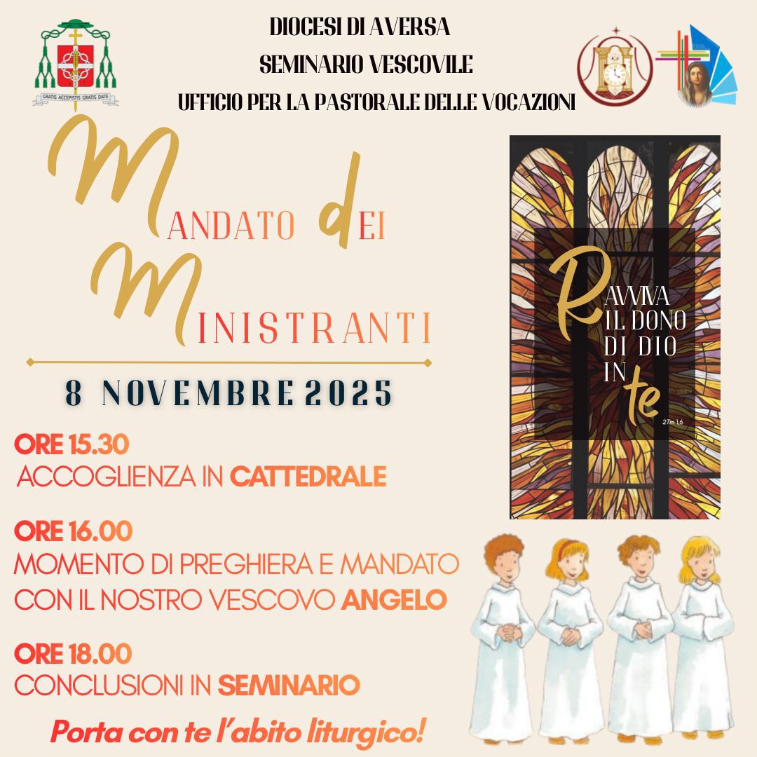 eventi, Giubileo 2025, news, News in evidenza, Ufficio Vocazioni 5 Novembre 2025 admindiocesi Sabato 8 novembre 2025, Mandato dei Ministranti in Cattedrale Sabato 8 novembre 2025, ore 15.30 Chiesa Cattedrale Mandato dei Ministranti con il nostro Vescovo Angelo Sarà anche una bella occasione per parlare ai ragazzi della vocazione e del dono di servire il Signore nella Chiesa. CondividiFacebookTwitteremailLinkedin Mandato Ministranti