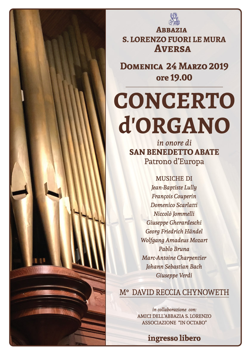 Domenica 24 Marzo 2019 alle 18:45, nell’Abbazia di San Lorenzo di Aversa, si terrà un Concerto d’Organo, evento che rientra nell’ambito delle iniziative organizzate in occasione della celebrazione della festività di San Benedetto, Patrono d’Europa.