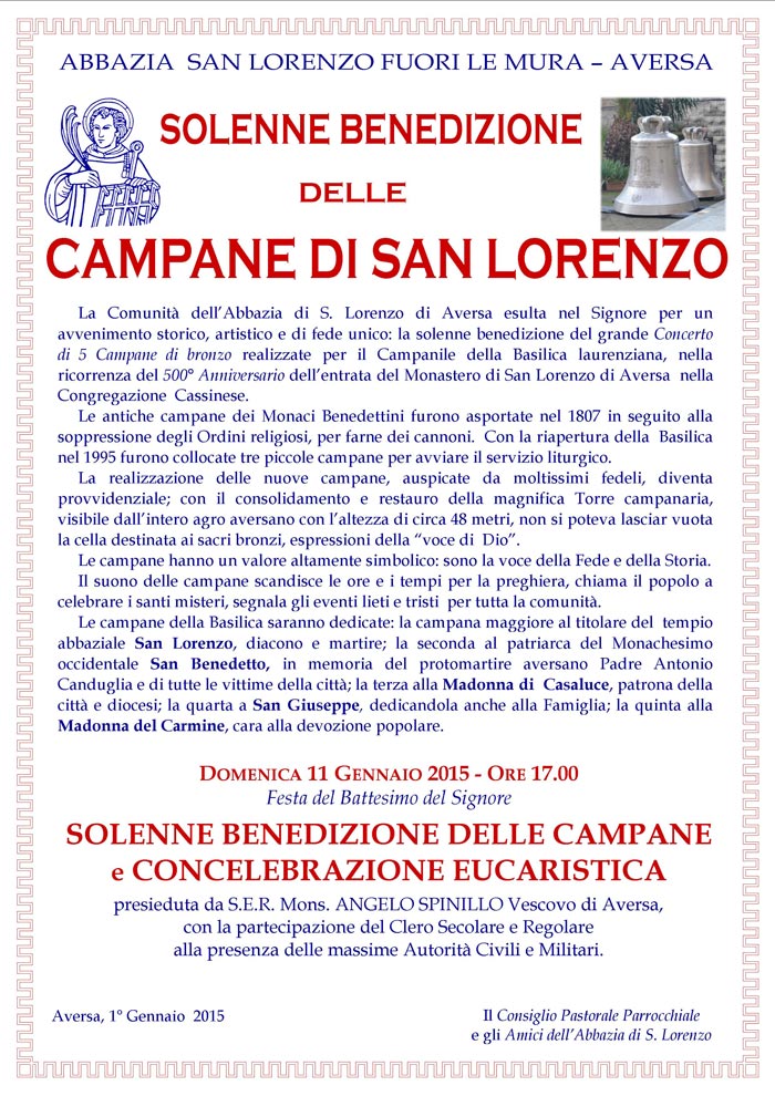 La Comunità dell’Abbazia di S. Lorenzo di Aversa esulta nel Signore per un avvenimento storico, artistico e di fede unico: la solenne benedizione del grande Concerto di 5 Campane di bronzo realizzate per il Campanile della Basilica laurenziana, nella ricorrenza del 500° Anniversario dell’entrata del Monastero di San Lorenzo di Aversa nella Congregazione Cassinese.