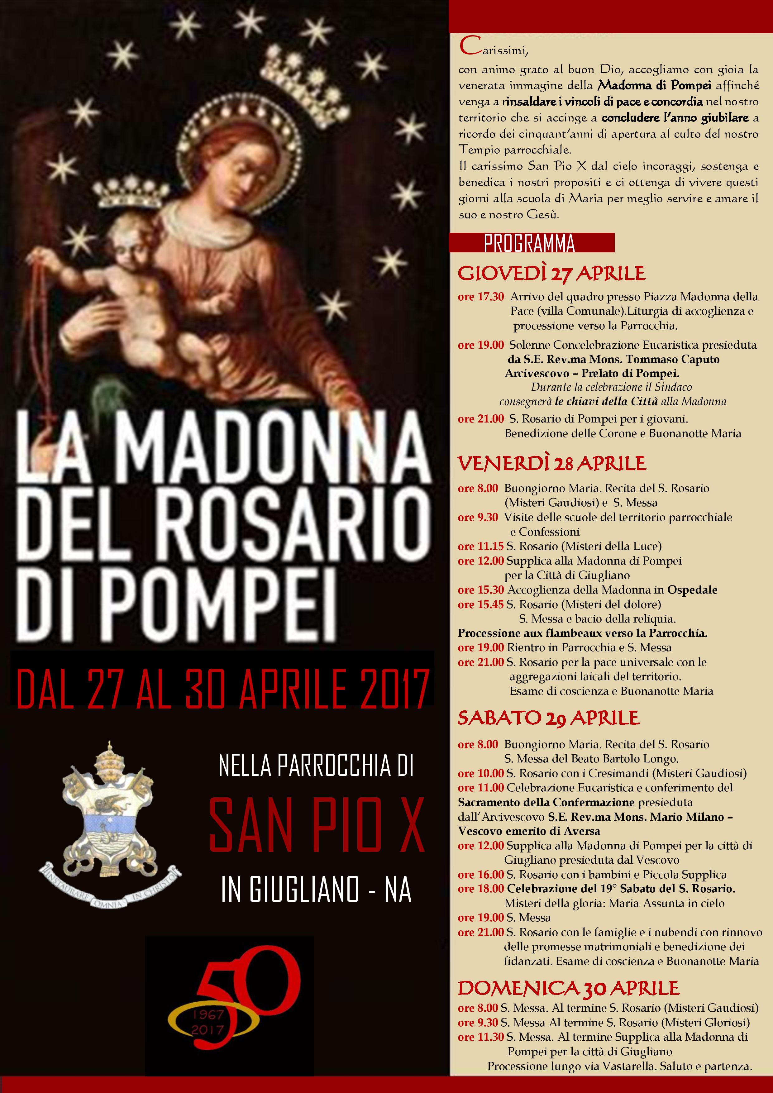 Carissimi, con animo grato al buon Dio, accogliamo con gioia la venerata immagine della Madonna di Pompei affinché venga a rinsaldare i vincoli di pace e concordia nel nostro territorio che si accinge a concludere l’anno giubilare a ricordo dei cinquant’anni di apertura al culto del nostro Tempio parrocchiale. Il carissimo San Pio X dal cielo incoraggi, sostenga e benedica i nostri propositi e ci ottenga di vivere questi giorni alla scuola di Maria per meglio servire e amare il suo e nostro Gesù.