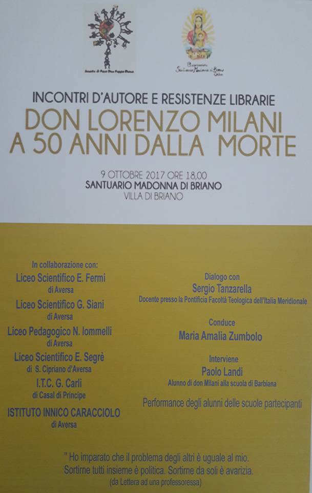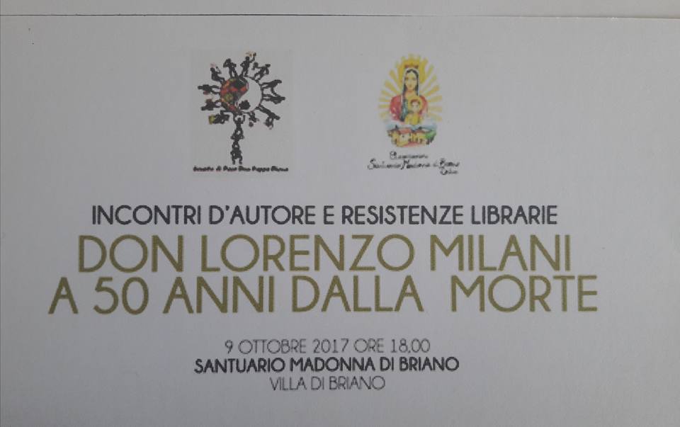 Per i 50 anni dalla morte di don Lorenzo Milani, lunedì 9 ottobre alle ore 18.00 al Santuario “Madonna di Briano” si terrà un seminario promosso dalle associazioni “Scuola di pace Don Diana” e “Associazione Madonna di Briano”.