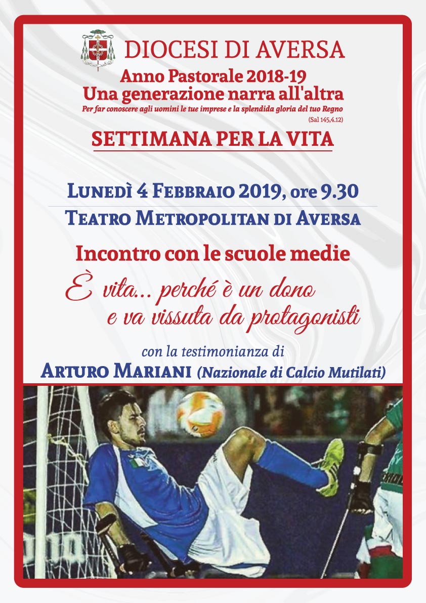 ore 9.30: Incontro, testimonianza con una rappresentanza delle scuole medie della Diocesi, con Arturo Mariani presso il Teatro Metropolitan – Aversa
