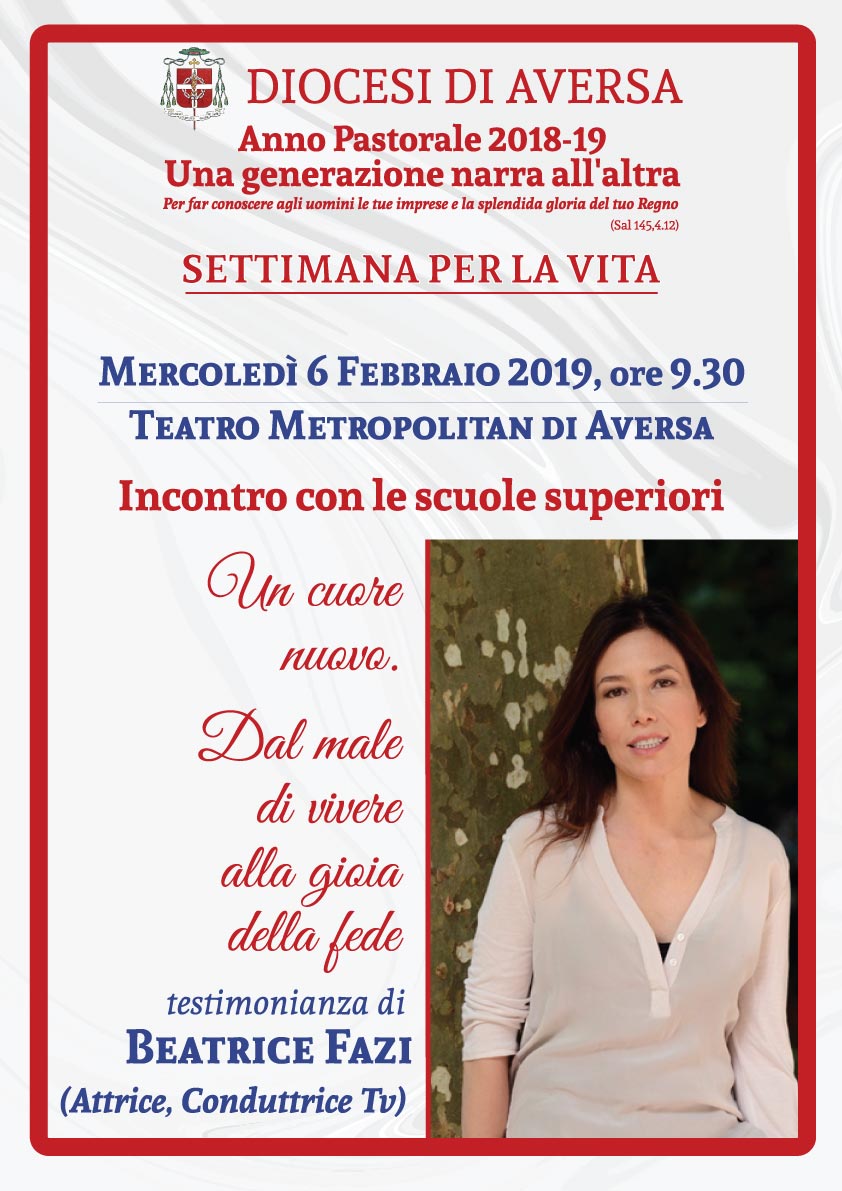 ore 9.30: Incontro, testimonianza con una rappresentanza delle scuole superiori della diocesi, con Beatrice Fazi attrice, conduttrice TV presso il Teatro Metropolitan – Aversa