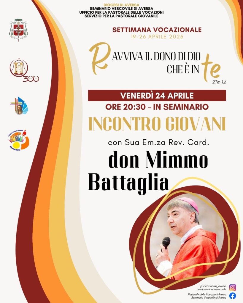 Un appuntamento imperdibile per tutti i giovani della diocesi! Venerdì 24 aprile alle ore 20:30, in Seminario, vivremo una serata di dialogo e ascolto con Sua Em.za il Card. Mimmo Battaglia. In collaborazione con il Servizio per la Pastorale Giovanile, un invito a riscoprire il fuoco che portiamo dentro. Non mancare!